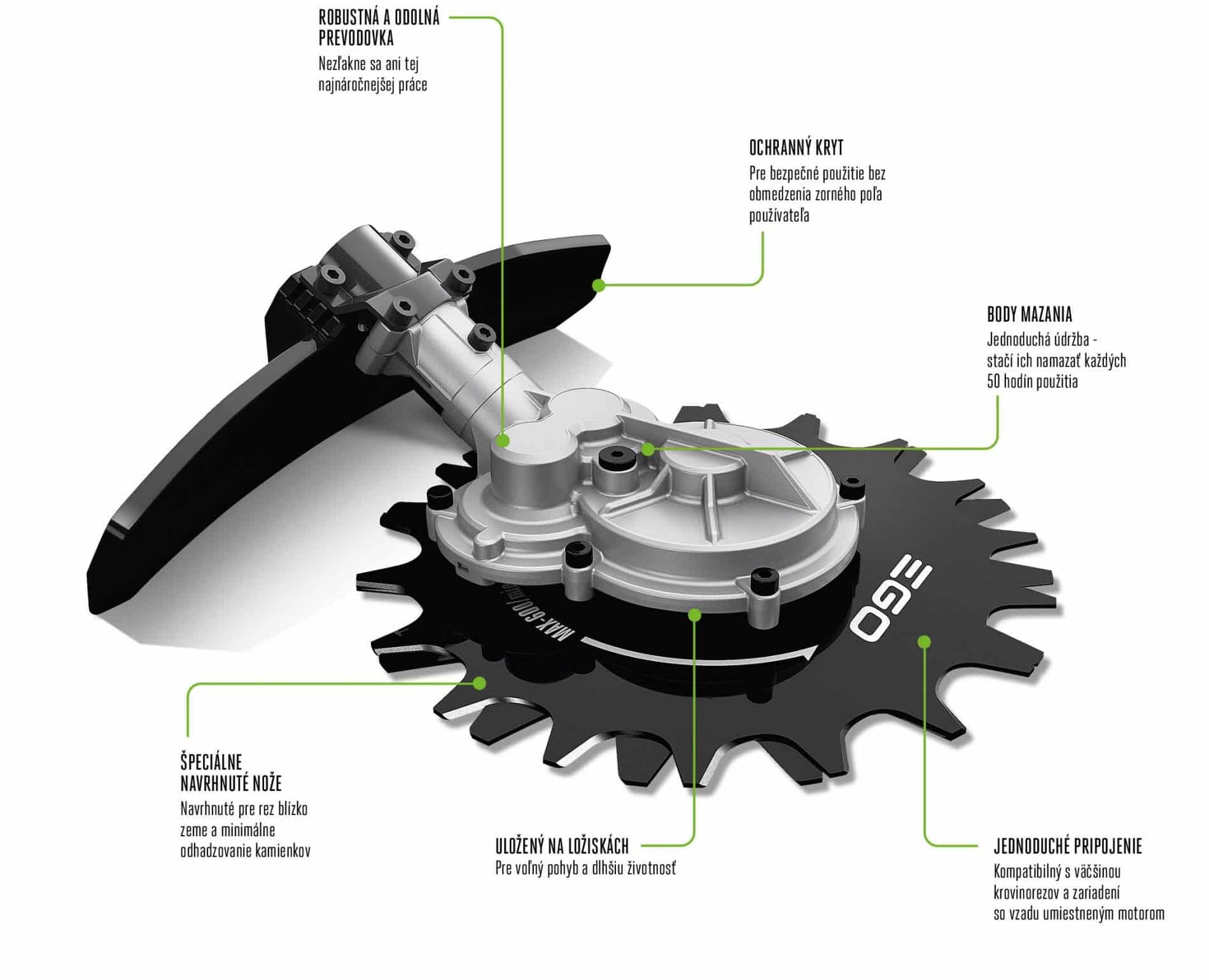 EGO POWER Professional-X nadstavec Strihací kotúč si s ľahkosťou poradí s trávou, burinou, machom na betóne, chodníku, alebo na okraji tránika. Pozostáva z dvoch nožov rotujúcich v opačnom smere namiesto rotácie v jednom smere, čo predlžuje prevádzkový čas, no najmä zabraňuje odhadzovaniu kamienkov počas použitia, čo robí Strihací kotúč ideálnym pre použitie v mestskom prostredí, kde je risk zranenia alebo škôd spôsobených odlietajúcimi kameňmi pri vyžínaní obzvlášť vysoký. Vďaka nízkemu profilu prevodovky je možné dosiahnuť aj na ťažko dostupné miesta.